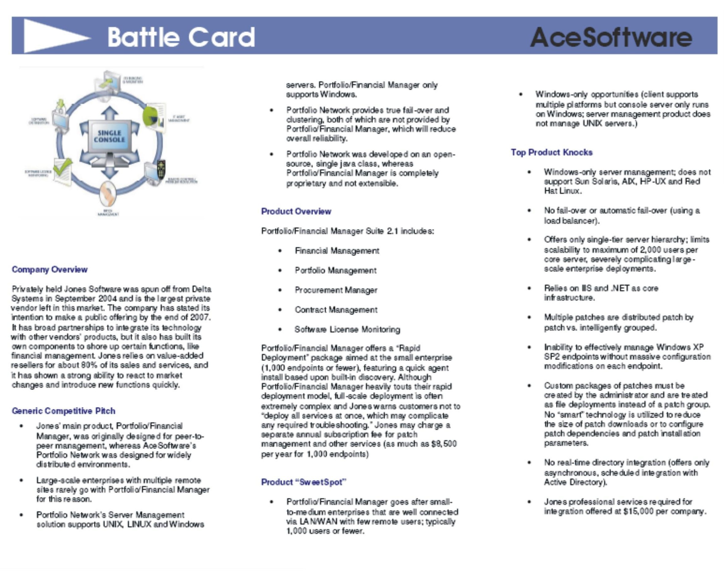 Battle Cards serve as a quick reference to enterprise sales reps by helping them to quickly identify key sell points while at the same time countering customer objections planted by a competitor. Sales Guides, the next level of detail beyond a Battle Card, provide a more in-depth comparison of a target competitor relative to a client offering, enabling sales reps to quickly hone in on product features, strengths and weaknesses, product pricing, sales landmines and general competitive messaging.